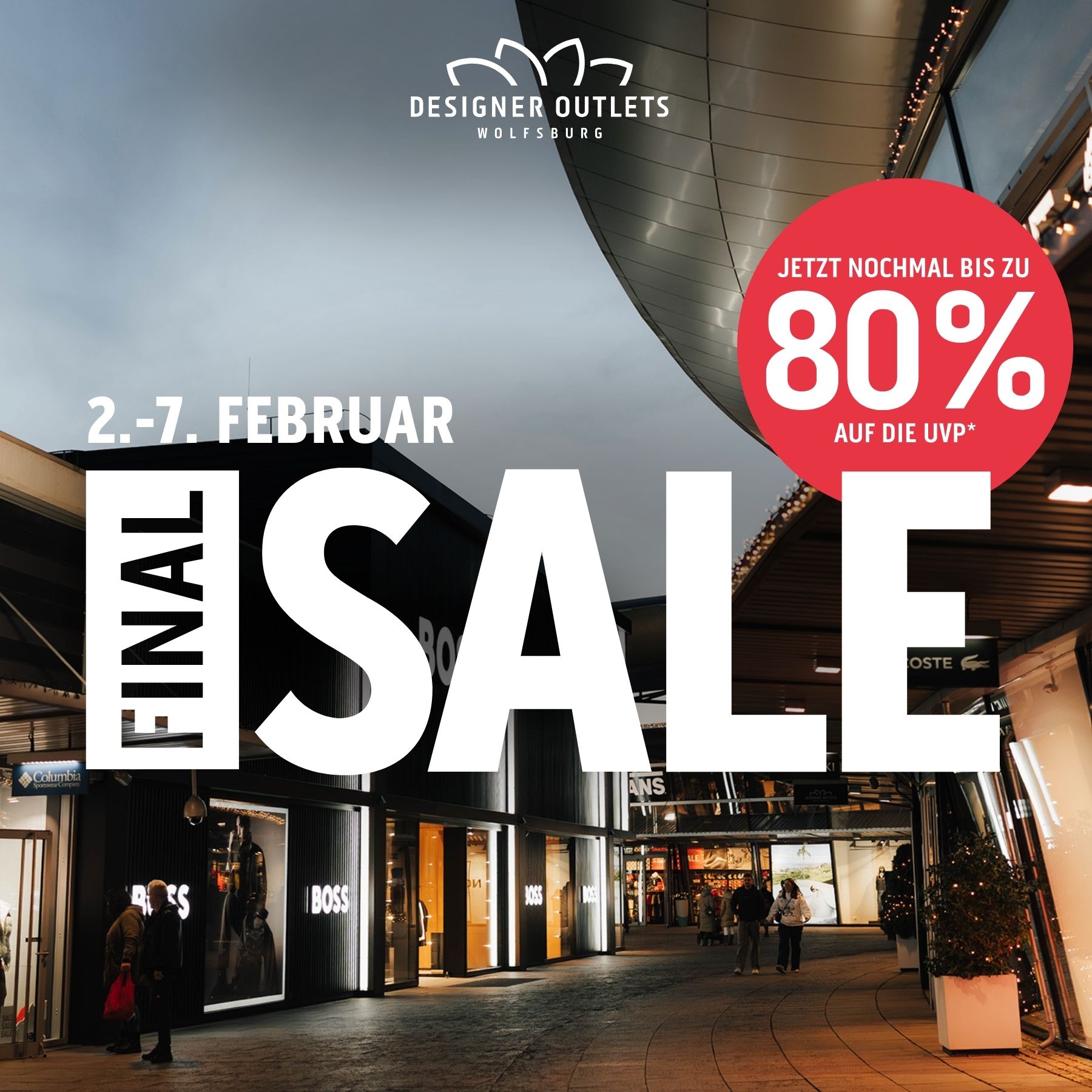 Zum Finalspiel der Fußball-Europameisterschaft der Frauen veranstalten die Designer Outlets Wolfsburg in partnerschaftlicher Zusammenarbeit mit dem VfL Wolfsburg am Sonn- tag, den 31. Juli 2022 kurzfristig ein kostenloses Public Viewing. Die Live-Übertragung bildet den Ab- schluss des am Sonntag in den Designer Outlets Wolfsburg stattfindenden Street Music Festivals und wird mit Unterstützung der Stadt Wolfsburg und der Wolfsburg Wirtschaft und Marketing GmbH (WMG) durchgeführt.
